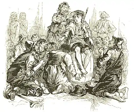 "A GRIM AND UNSIGHTLY PICTURE."After a considerable time—he could not tell how long—his senses struggled to a half-consciousness, and as he lay with closed eyes vaguely wondering where he was and what had been happening, he noted a murmurous sound, the sullen beating of rain upon the roof. A snug sense of comfort stole over him, which was rudely broken, the next moment, by a chorus of piping cackles and coarse laughter. It startled him disagreeably, and he unmuffled his head to see whence this interruption proceeded. A grim and unsightly picture met his eye. A bright fire was burning in the middle of the floor, at the other end of the barn; and around it, and lit weirdly up by the red glare, lolled and sprawled the mothest company of tattered gutter-scum and ruffians, of both sexes, he had ever read or dreamed of. There were huge, stalwart men, brown with exposure, long-haired, and clothed in fantastic rags; there were middle-sized youths, of truculent countenance, and similarly clad; there were blind mendicants, with patched or bandaged eyes; crippled ones, with wooden legs and crutches; there was a villain-looking peddler with his pack; a knife-grinder, a tinker, and a barber-surgeon, with the implements of their trades; some of the females were hardly-grown girls, some were at prime, some were old and wrinkled hags, and all were loud, brazen, foul-mouthed; and all soiled and slatternly; there were three sore-faced babies; there were a couple of starveling curs, with strings about their necks, whose office was to lead the blind.
