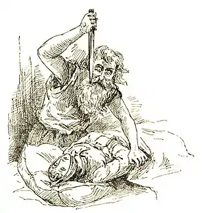 The rest was lost in inarticulate mutterings. The old man sunk upon his knees, his knife in his hand, and bent himself over the moaning boy—