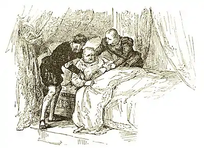 "THE ATTENDANTS EASED HIM BACK UPON HIS PILLOWS.""Please your majesty, you did take it from me two days since, saying it should no more do its office till your own royal hand should use it upon the Duke of Norfolk's warrant."