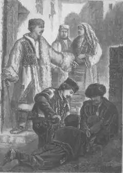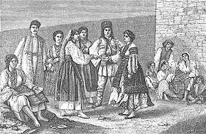 The people of Moldo-Wallachia, though unhappily given over to what seems inveterate sloth and an inordinate love of frivolous pleasures, are still a tall, strong, and comely race, "with oblong countenance, black hair, thick and well-arched brows, a lively eye, small lips, and white teeth." The Wallachians are more vivacious and pleasure-loving than their Moldavian compatriots; amidst their indolence and ignorance, however, both people are sober, frugal, and courageous on occasion. It has been remarked that while the Moldo-Wallachians of the cities and towns betray a Greek type of physiognomy, those of the rural districts still retain marked Roman features. The upper classes are excessively and even ludicrously haughty. They keep themselves ostentatiously aloof from the rest of the community, and are not disposed to be hospitable to strangers. The nobility, divided into many grades, and numerous, were, under the old order of things, the controlling political element, and still retain no small portion of their formerly unquestioned authority. The "boyards," or old Dacian nobility, have become much degenerated by the fashionable and dissipated life of the city, but the remains of the old landed aristrocracy are still to be found in the rural districts. The country boyard is usually athletic and handsome, and retaining as he does the ancient national costume, is a very picturesque personage. He wears a black Astrakhan cap shaped like a turban, a large mantle of fur or sheep-skin, this being embroidered in gay colors. It is observed that the costumes of the upper Wallachian peasants, with their sandals, cloaks, and tunics, are very similar to those worn by the Roman peasantry in the days of the empire.