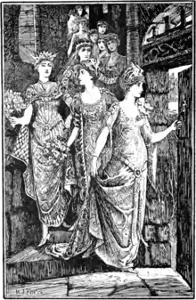 The sleeping King, guided by his attendants, cuts the finger of the beautiful Maiden