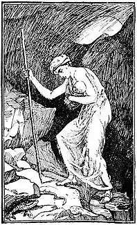 For three days and three nights she struggled through it, but could find nothing. She was quite worn out with weariness and hunger, and even her staff was no further help to her, for in her many wanderings it had become quite blunted. She almost gave up in despair, but made one last great effort, and suddenly in a thicket she came upon the sort