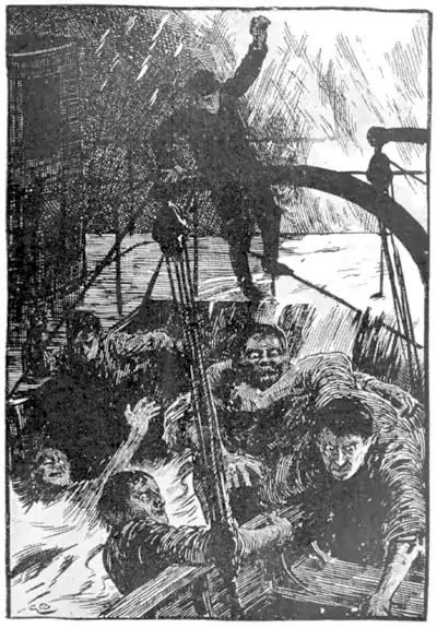 "You, there!" cried he to a small group of lascars and of seamen huddled up near the windlass. "Where's Nicolini?"