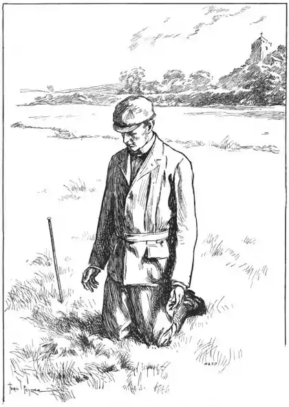 When he reached the field not a soul was anywhere to be seen; a few sheep browsed here and there, and high overhead a lark was singing. At once he took a bearing from the church spire. He was a little time in getting the right pointing; he had to move step by step to the right, continuing to take observations, until at last the church weather-cock bore truly 146¼° through the sight-vane of the compass. Turning half round, he took an observation of the distant mill. He was a long way out this time; so carefully preserving his relative position to the church, he backed away, taking alternate observations of either object until both spire and mill bore in the right directions. The point where the two bearings intersected was some fifty yards from the brink of the Tillingham, and, marking the spot with his compass, Pringle began to probe the earth in a gradually widening circle, first with one section of his rod, then with another joint screwed to it, and finally with a length of three, so that the combination reached to a depth of eight feet. He had probed every square inch of a circle described perhaps twenty feet from the compass, when he suddenly stumbled upon a loose sod, nearly impaling himself upon the sounding rod; and before he could rise his feet, sliding and slipping, had scraped up quite a large surface of turf, as did his hands, in each case disclosing the fat, brown alluvium beneath. A curious fact was that the turf had not been cut-in regular strips, as if for removal to some garden; neatly as it was relaid, it had been lifted in shapeless patches, some large, some small, while the soil underneath was all soft and crumbling, as if that too had been recently disturbed. Someone had been before him! Cramped and crippled by his prolonged stooping, Pringle stretched himself at length upon the turf. As he lay and listened to the song that trilled from the tiny speck just visible against a woolly cloud, he felt that it was useless to search further. That a treasure had once been hidden thereabouts he felt convinced, for anything but specie would have been useless at such an unsettled time for commercial credit, and would doubtless have been declined by Shipperbolt; but whatever form the treasure had taken, clearly it was no longer present.