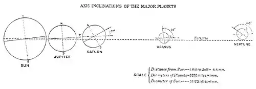 Shown by axial rotation A glance at the axial inclinations of the outer shown by and the inner planets betrays a break in the symmetry of their arrangement. Each, taken by itself, evinces a gradual righting of the axis as one approaches the Sun. This appears strikingly from the table of the inclinations of the equators of the several planets to the planes of their orbits.