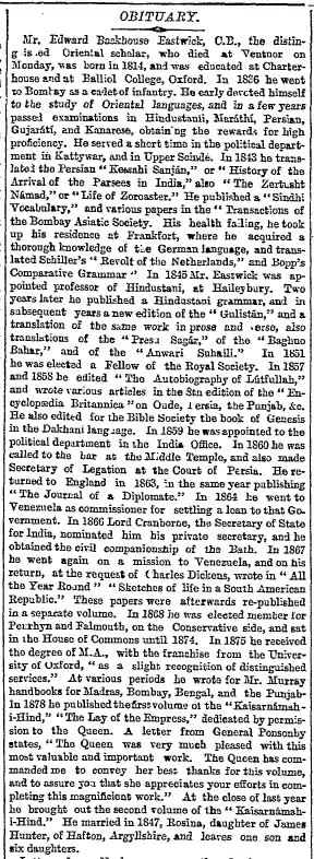 Mr. Edward Backhouse Eastwick, C.B., the distinguished Oriental scholar, who died at Ventnor on Monday, was born in 1814, and was educated at Charterhouse and at Balliol College, Oxford. In 1836 he went to Bombay as a cadet of infantry. He early devoted himself to the study of Oriental languages, and in a few years passed examinations in Hindustani, Maráthí, Persian, Gujarátí, and Kanarese, obtaining the rewards for high proficiency. He served a short time in the political department in Kattywar, and in Upper Scinde. In 1843 he translated the Persian "Kessahi Sanján," or a History of the Arrival of the Parsees in India," also "The Zertuaht Námad," or "Life of Zoroaster." He published a "Sindhi Vocabulary," and various papers in the "Transactions of the Bombay Asiatic Society. His health failing, he took up his residence in Frankfort, where he acquired thorough knowledge of the German language, and translated Schiller's "Revolt of the Netherlands," and Bopp's Comparative Grammar." In 1845 Mr. Eastwick was appointed professor of Hindustani, at Haileybury. Two years later he published a Hindustani grammar, and in subsequent years a new edition of the "Gulistān," and a translation of the same work in prose and verse, also translations of the "Presa Sagár," of the "Baghuo Bahar," and of the "Anwari Suhaili." In 1851 he was elected a Fellow of the Royal Society. In 1857 and 1858 he edited "The Autobiography of Lútfullah," and wrote various articles in the 8th edition of the "Encyclopædia Britannica" on Oude, Persia and the Punjab, &c. He also edited for the Bible Society the book of Genesis in the Dakhani language. In 1859 he was appointed to the political department of the India Office. In 1860 he was called to the bar at the Middle Temple, and also made Secretary of Legation at the Court of Persia. He returned to England in 1863, in the same year publishing "The Journal of a Diplomate." In 1864 he went to Venezuela as commissioner for settling a loan to that Government. In 1866 Lord Cranborne, the Secretary of State for India, nominated him his private secretary, and he obtained the civil companionship of the Bath. In 1867 he went again on a mission to Venezuela, and on his return, at the request of Charles Dickens, wrote in "All the Year Round" "Sketches of life in a South American Republic." These papers were afterwards re-published in a separate volume. In 1868 he was elected member for Pennrhyn and Falmouth, on the Conservative side, and sat in the House of Commons until 1874. In 1875 he received the degree of M.A., with the franchise from the University of Oxford, "as a slight recognition of distinguished services." At various periods he wrote for Mr. Murray handbooks for Madras, Bombay, Bengal, and the Punjab. In 1878 he published the first volume of the "Kaisarnámah-i-Hind," "the Lay of the Empress," dedicated by permission to the Queen. A letter from General Ponsonby states, "The Queen was very much pleased with this most valuable and important work." At the close of last year he brought out the second volume of the "Kaisarnámah-i-Hind." He married in 1847, Rosina, daughter of James Hunter, of Hafton, Argyllshire, and leaves one son and six daughters.