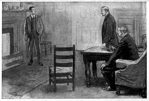 'Is this the residence of Mr. Summertrees? Oh, is that you, Podgers? Is Mr. Summertrees in? Very well. This is Hale. I am in Valmont's flat—Imperial Flats—you know. Yes, where you went with me the other day. Very well, go to Mr. Summertrees, and say to him that Mr Macpherson wants the encyclopedia for 1893. Do you get that? Yes, encyclopedia. Oh, he'll understand what it is. Mr. Macpherson. No, don't mention my name at all. Just say Mr. Macpherson wants the encyclopedia for the year 1893, and that you are to bring it. Yes, you may tell him that Mr. Macpherson is at Imperial Flats, but don't mention my name at all. Exactly. As soon as he gives you the book, get into a cab, and come here as quickly as possible with it. If Summertrees doesn't want to let the book go, then tell him to come with you. If he won't do that, place him under arrest, and bring both him and the book here. All right. Be as quick as you can; we're waiting.'