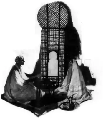 “Yoo-yoo ....” very faintly from the distance, and Hassan rode alone to the little house, dismounted, and entered the bride's chamber. She sat cross-legged on a low divan. She was veiled from head to foot.