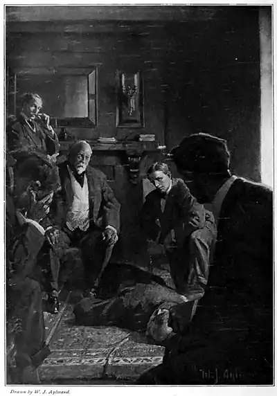 A soft tap on the door followed, and as the two older men looked with one accord at Weldon, he pushed aside the portières and admitted Mr. Fayles, a thin, aristocratic, iron-gray man, who made himself one of them without a word. Stepping to the body he looked a moment, then sank into the chair Weldon had occupied during his interview, fitted his gloves into his top hat, dropped it beside him, and with an extraordinary convulsion of countenance buried his face in his hands. After a moment's annoyed contemplation of his motionless figure, Weldon met Dupont's eyes inquiringly. The brother-in-law shook his head, no wiser, evidently. Weldon gestured imperiously toward the fat man, and Dupont tiptoed over to him, whispering hoarsely, "I didn't know he was so attached to Edward, did you, Potter?"