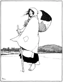 Soon they came up with a poor Irishwoman, trudging along with a bundle at her back. She had a grey shawl over her head, and a crimson-madder petticoat, so you may be sure she came from Galway. She had neither shoes nor stockings, and limped along as if she were tired and footsore; but she was a very tall, handsome woman, with bright grey eyes, and heavy, black hair hanging about her cheeks. And she took Mr. Grimes' fancy so much, that when he came alongside he called out to her: