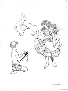 Tom was frightened at the notion of a schoolmistress; for he thought she would certainly come with a birchrod or a cane; but he comforted himself, at last, that she might be something like the old woman in Vendale—which she was not in the least; for, when the fairy brought her, she was the most beautiful little girl that ever was seen, with long curls floating behind her like a golden cloud, and long robes floating all round her like a silver one.