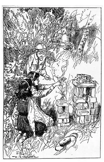 It is very hard to make small pieces of green things burn in a cocoa-tin lid in the open air by means of a box of matches and the fragments of a potato-dampened envelope from an aunt in Italy. Nothing much happened except smoke, and the head of a match burnt Charles's finger.