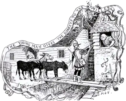 He tied them all three with a rope, and drove them away till he came to a mill. He knocked at the window, and the miller put his head out and asked what he wanted.