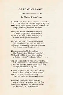 - Coates, Florence Earle (1913), as "In Remembrance: The Antarctic Heroes of 1912" in Lippincott's Monthly Magazine (July 1913).