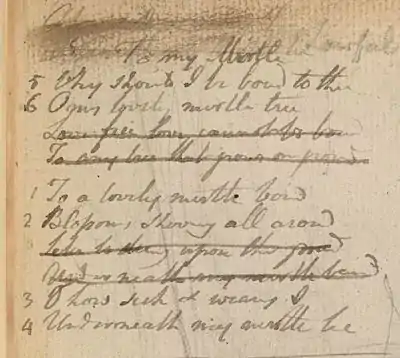 He then canceled, selected, and rearranged lines to make the present poem, all that remains not lined through in the Notebook, and he gave it a title. (A similar process of reduction takes place with the “Fayette” lines. See below.)