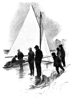 There are two popular styles of rig: the jib and mainsail—like a sloop—and the lateen, a single sail triangular in shape. But whatever rig is used, the effort is made to have the center of weight as low as possible, and to this end the sails are made broad and low as compared with the sails on water boats. By lowering the center of weight the danger of capsizing is lessened.