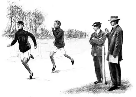 On the whole the team promised to be fairly good; Mr. Cobb acknowledged in April that his first judgment had been hasty. In the distances there were four runners: Somes, Chase, Warren, and Townsend, all of whom were doing very creditable work. Perhaps there was some disappointment over Dick himself, for the story had spread throughout the school that he was a wonder at the mile and his present performances were not vindicating that reputation. But probably the fact that he had so many affairs to attend to told against his track prowess. He didn’t seem to do any troubling about it, anyhow, and it was very generally agreed that if he continued to make as good a captain as he did at present he would be doing his full duty. There was one real find, however, to delight Dick’s heart. And that was Mr. Thomas H. Eaton, familiarly known as Chub. Chub was doing great work in the 100-yards dash and very creditable in the two-twenty. Running him close in the former event was Walker, while at the longer distance Post was showing up well and promised to become a fine sprinter in time. For the middle distances there were Roy, Pryor and Kirby, none of them above the average. Kirby was also hurdling and he and Glidden were showing up fairly well. The pole vault had but one performer, Cullum of the Second Middle. Walker and Cole were making hard work of the jumps, and in the weight events Post, Harris and Fernald were struggling for supremacy.