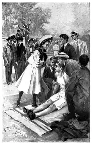 “The big boy with the yellowish hair,” she whispered. “And the little one is Chase. And Townsend’s next to him on the left. The boy with black hair, the one with the cherry-and-black ribbon across his shirt is Connor! He’s Hammond’s crack distance runner. I—I hope he won’t win!”