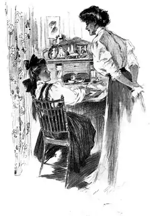 But Harry had clasped both hands to her mouth and was looking so distressed that her mother took pity on her. “Very well, my dear, I won’t ask you any more questions. But don’t get into mischief.” She kissed Harry and retired smiling. Harry returned to the desk with a loud sigh of relief and seated herself for the completion of her task.