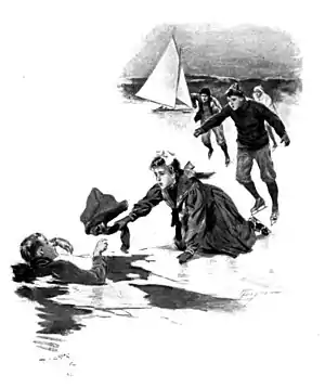 Chub’s signaling was unnecessary, however, for the two occupants of the boat had already seen the catastrophe and were headed toward the group. Harry’s sweater, as well as Chub’s and the two worn by Sid, were thrown over Roy, and Dick and Chub were rubbing and slapping him when the ice-boat rounded to and came up into the wind with flapping sail.