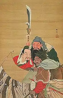![]() Zhang Fei's weapon may have looked something like the one in this Qing Dynasty handscroll, but slightly longer Cheng Yuanzhi was furious, so he dispatched Deng Mao, his second in command, to mount an offensive. Zhang Fei raised his 1.8 zhang snake lance,[45] and thrust it straight out, piercing the center of Deng Mao's chest with exact precision,[46] who then doubled over and fell from his horse. Having witnessed Deng Mao's demise, Cheng Yuanzhi whipped his horse into action. Raising his sword above his head with a flourish, he went straight after Zhang Fei. Yunchang swung around his large blade, and rode out on his horse at full gallop. Cheng Yuanzhi was completely taken aback at the sight of this, and was unable to react in time. He was cut in two at the point where Yunchang had raised his blade. People in later generations wrote a poem in praise of the two: |