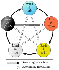 - ↑ Zou Yan, an influential thinker during the Warring States Period, had developed a rather complex theory regarding the influence of the five elements (Tree, Earth, Water, Fire, Metal) on dynastic rule. His theories (known in Chinese as 五德終始說) had become popular among historians and scholars of ancient China. According to Zou Yan's theory, each dynasty was represented by one of the elements. Prior to the time of Wang Mang, the Han Dynasty was said to be represented by the Earth element. This was based on the Overcoming cycle of the five elements: Yellow Emperor (Earth) -> Xia Dynasty (Tree) -> Shang Dynasty (Metal) -> Zhou Dynasty (Fire) -> Qin Dynasty (Water) -> Han Dynasty (Earth). However, Wang Mang altered the classification of the dynasties in order to justify usurping the throne. Instead of using the Overcoming cycle of the five elements, he chose to use the Generating cycle (leaving out the Qin Dynasty, which he regarded as illegitimate), thus: Yellow Emperor (Earth) -> Xia Dynasty (Metal) -> Shang Dynasty (Water) -> Zhou Dynasty (Tree) -> Han Dynasty (Fire).