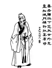 After Li Ru finished reading the proclamation, Zhuo ordered his aides to assist the emperor off of the throne. They confiscated his imperial jade seal, which had a silk cord attached to it; they made him kneel down facing north, declare himself a vassal, and agree to obey any orders given to him.[4] They also instructed the empress dowager to remove her royal vestments, and await the imperial decree. Both the emperor and the empress dowager began to wail and cry, and all of the ministers were saddened. A senior minister, who was standing at the base of the throne, became angry and screamed out, "Dong Zhuo, you villainous scoundrel! You dare carry out a scheme which deceives heaven. I shall stain you with the blood of my severed neck!"[5] With that, he raised his ivory tablet and lunged at Dong Zhuo,[6] intending to strike him. Zhuo was outraged, and ordered the soldiers to seize him. It was chief of staff Ding Guan. Zhuo ordered him to be dragged outside and beheaded. Guan shouted expletives non-stop, and did not change his demeanor until he was dead. People of later generations wrote a poem lamenting him, it went: |