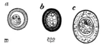 The ova of Ascaris lumbricoides (Fig. 168, f, g, and Fig. 171) are considerably larger (60 to 75 μ by 40 to 58 μ) than those of trichiuris (Fig. 168, c). They are also, as a rule, more spherical, or rather, more broadly oval; occasionally they are almost barrel-shaped. Like those of trichocephalus, they are dark brown in colour from bile-staining, but they are much less sharply and smoothly defined, possessing a coarse thick shell which is roughened by many warty excrescences. The yolk contents are not always easily made out, nor, when made out, can any sign of embryo or segmentation be discovered.