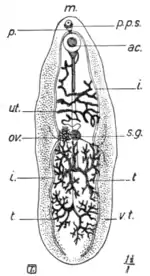 History.—This parasite was described by Lewis and McConnell in 1876 from two sets of specimens, the first procured from O'Brien and Curran, who found them in the vicinity of the ileo-colic valve at the post-mortem of an Assamese in Gowhatty; the second belonging to the Pathological Museum of the Calcutta Medical College, and presented in 1857 by Simpson, who found them in the cæcum and ascending colon of an Indian who died from cholera in the Tirhoot jail hospital. G. hominis is now found to be a much more common parasite of man than was formerly supposed. A study of serial sections has convinced Leiper of the necessity of removing it from the genus Gastrodiscus on the following grounds: (1) the presence of a large imminent genital papilla in place of the genital atrium of gastrodiscus; (2) testes tandem; (3) genital orifice on the neck, not on the ventral surface; (4) ventral aspect of the disc smooth and quite free from sucker-bearing papillæ.