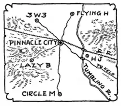 Southwest, about three miles from town, was Curt Bellew’s Lazy B. This was on the west side of the river. A little less than three miles to the northeast of Pinnacle City was Uncle Hozie Wheeler’s Flying H; and four miles northwest of town was Buck West’s 3W3 outfit.