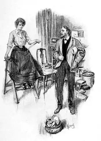 The next morning, in spite of the difficulty of getting about, the step-ladder had been reërected, and the business of tapestry-hanging was going forward with enthusiasm, when a knock suddenly interrupted the work.