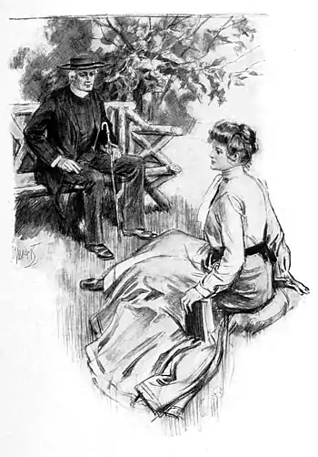 Patty gazed mournfully down on the campus, almost on the verge of tears over her lost youth, when a step suddenly sounded on the gravel path, and she looked up with a startled glance to see a churchly figure rounding the hill. Involuntarily she prepared for flight; but the bishop had spied her, together with a little rustic seat under a tree, and he smiled upon the one and dropped down upon the other with a sigh of content.