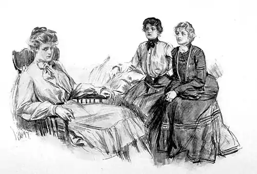 Patty walked gloomily down the corridor, lost in meditation. Her way led past the door of the doctor's office, which was standing invitingly open. Three or four girls were sitting around the room, laughing and talking and waiting their turns. Patty glanced in, and a radiant smile suddenly lightened her face, but it was instantly replaced by a look of settled sadness. She walked in and dropped into an arm-chair with a sigh.