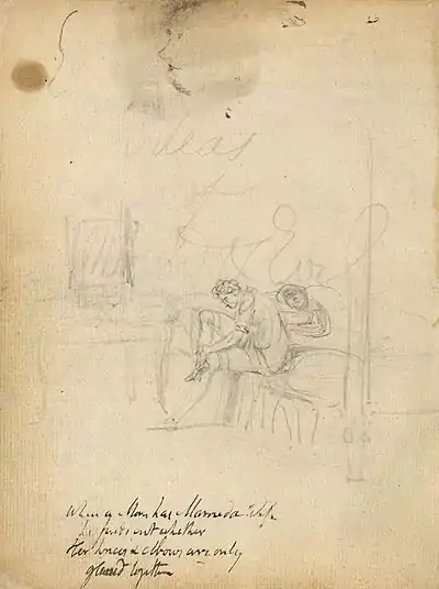 - ↑ There is a picture above this short poem showing of a man and woman rising from bed in a sparsely furnished room that could be Blake's own. The line of text obscured by the picture is Ideas of Good & Evil that could be a title to 64 following picture emblems, 17 of which were used for the book "For Children: The Gates of Paradise" (1793). D. G. Rossetti in his publication of Blake's poetry (in the 2nd vol. of Life of William Blake, by Alexander Gilchrist, D. G. Rossetti, W. M. Rossetti, Anne Gilchrist, 1863 & 1880) as well as W. B. Yeats in his edition of The Poems of William Blake used this as a title for the series of poems from the manuscripts. — Ed. of Wikisource