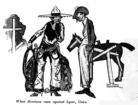 The other day I ran across a little friend of mine known as Jimmy Tough, ex-buster in the "Bill Show." Jimmy is on the blacklist in Wyoming, because of his expertness with rope and telegraph wire. No Wyoming cowman wants anybody but himself to brand a maverick. I know one or two Wyoming and Colorado fortunes which have got into statesmanship by the maverick route; but the owners of these fortunes were among the first to take away the individual iron from the ranch foreman. Jimmy was now doing a turn in Advanced Vodeveel, with a good roper from Oklahoma. He was at the time I met him got up in regular Brooklyn costume, fit to go into a picture. Seeing this, I indicated my mild belief that he was somewhat scary.