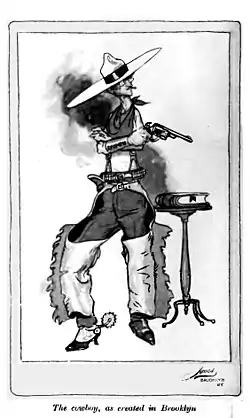 He did send for the photograph, and finally got it—from Brooklyn. It was a handsome photograph. The six-shooter was carefully displayed upon the abdomen; the hats, spurs, handkerchief, and other details were arranged in that due sequence established by the Wild West type. The "chaps" were in evidence, those leather trousers always worn on the stage by Wild west actors and never worn anywhere by real cowmen if they can help it—and then usually called leggins. There was nothing missing form the catalogue of articles characterized as Western by all New York and Brooklyn authors, actors, and artists, and nothing wrong as to their disposition; nothing except that the earnest young author, when he posed for the picture, had put his leather panties on wrong side foremost!
