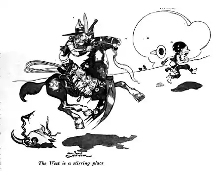 There is hardly one of there book or magazine illustrations of Wild West description done by Eastern artists with which some technical fault cannot be found. For instance, a year or so ago I had a book published which had something to do with the personal history of the old-time Western sheriff, Pat Garrett, who lived in New Mexico at the same time I did, some several years since, and who quietly laid away a number of the worst bad men of that district, among others Billy the Kid, one of the worst killers the West ever knew. No one ever saw Pat Garrett in Wild West make-up, or ever will. Like most of the frontier sheriffs, he was always quiet and simple in the extreme. But what happened to him in the book? The publishers gave it out to be illustrated by an artist from Lyme, Connecticut, and what the artist did I shiver to contemplate even in retrospect. There was a fleeing desperado at one corner of the page, and in the center of the picture was a horse with its legs tied in knots, surmounted by a fierce bandit in "chaps," who, while his steed was at mid-jump in the air, was calmly firing at the fleeting desperado aforesaid. Below, in his joy at labelling a great work of art, the book editor had the legend: "Pat Garrett in pursuit of a Criminal." It was with difficulty that I could appease the former sheriff—even after we had called in every known copy of the book available and torn out the offending "illustration." The publishers and injured and aggrieved to this day, and cannot understand why any one should object to such a typical Wild West "illustration." Yet there could be more grievous insult to a brave man who all his life had lived simply and sincerely, and despised anything like Wild Westism. Which was strong, the man or the "illustration"? I know the Brooklyn and Lyme answer perfectly well. (Since this was written Pat Garrett has been killed. It is just as well, and as good a way to go as any. He has missed many later criminals in art.)