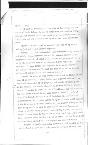 I, Howard P. Lovecraft of the city of Providence in the State of Rhode Island, being of sound mind and memory, make, execute and declare this instrument as my last will, hereby revoking any and all former wills by me at any time heretofore made.