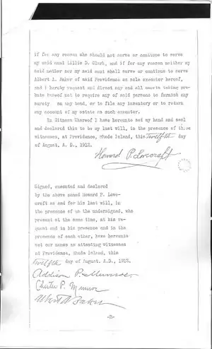 Signed, executed and declared by the above named Howard P. Lovecraft as and for his last will, in the presence of us the undersigned, who present at the same time, at his request and in his presence and in the presence of each other, have hereunto set our names as attesting witnesses at Providence, Rhode Island, this twelfth day of August, A.D., 1912.