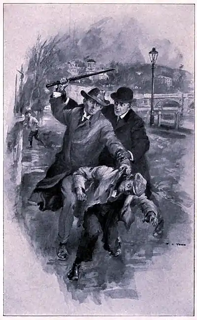 At that unlucky moment, one small suburban Arab, in full flight from another, dashed round the corner and butted into that part of Delavoye which the Egyptian climate had specially demoralised. I saw his dark face writhe with pain and fury. With one hand he caught the offending urchin, and in the other I was horrified to see his stick, a heavy blackthorn, held in murderous poise against the leaden sky, while the child was thrust out at arm's length to receive the blow. I hurled myself between them, and had such difficulty in wresting the blackthorn from the madman's grasp that his hand was bleeding, and something had tinkled on the pavement, when I tore it from him.