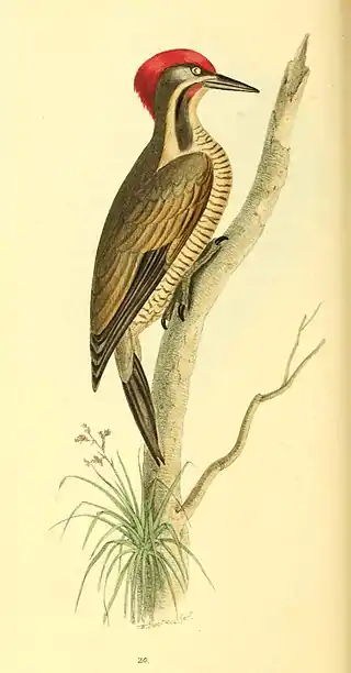 - Olive Woodpecker: beneath fulvous, with transverse blackish bands. Head sub-crested, above red, the sides with olive, yellow, and red streaks.