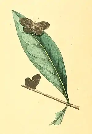 - Antennæ short, the club somewhat truncate and compressed. Palpi very short, curved, hardly projecting beyond the head, closely compressed on the tongue, entirely covered with close imbricate scales, the tip naked. Body elongated, slender, in the male six-jointed, the last with two approximating incurved hooks; valves broad, thickened, truncate, and hooked. Wings in both sexes alike, broad, obtuse, rounded, very entire.