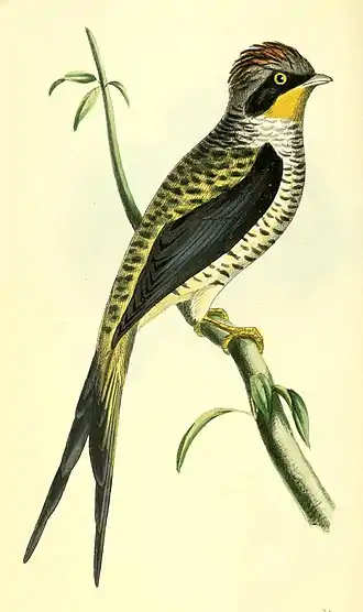 - Above black varied with yellow; beneath white, with transverse black bands; chin yellow. Head crested, the feathers rufous, varied with black. Wings, and elongated forked tail raven-black, immaculate.