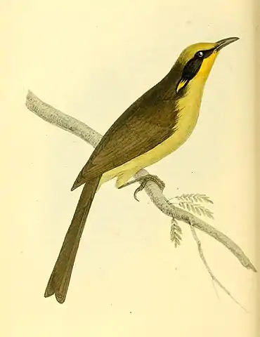 The Yellow-tufted Honeysucker, although described by Latham, has hitherto remained unfigured; and I therefore select it as an excellent example of a tribe of birds which I think are peculiar to Australasia, and which seem to hold the same situation among the birds of that vast country as the Humming-birds occupy in South America, and the Sun-birds (Cinnyris, Cuvier) in Africa and India; all of which more or less derive their sustenance from the nectar of flowers, and which they extract on the wing by means of their long tubular tongues.