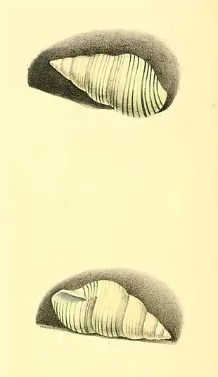 - Shell white, with capillary green bands; spire elongated, sub-attenuated, of six convex volutions; outer lip crenated; base slightly truncate.