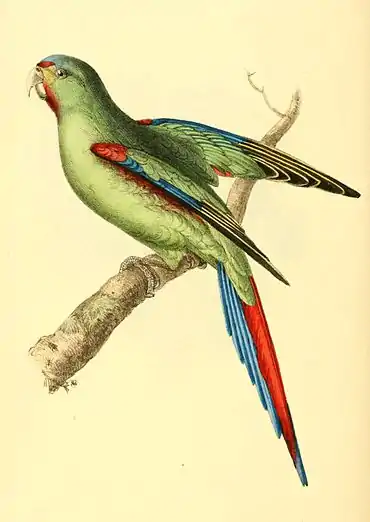 This is another of the splendid little Parakeets inhabiting the forests of New Holland; and vivid as the colouring may appear in our figure, it sinks into dullness when compared with the bird itself. Dr. Shaw was the first who described it in White's Voyage to New South Wales, where it is badly represented. It has been since figured by Le Vaillant, probably from a female or imperfect specimen, as the tail is represented by far too short, and the colours not quite agreeing with that in my collection.