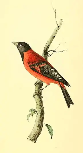 A richly coloured little bird, much smaller than our Goldfinch, and approaching very near to the Bouvreuil de Bourbon of Buffon, from which, however, I think it quite distinct. The only one I have yet seen is in the possession of E. Falkner, Esq. of Fairfield near Liverpool, who received it with a few other rare birds from the Spanish Main.