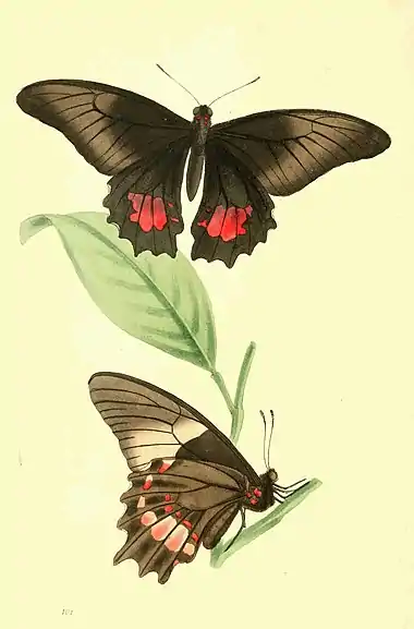 Both sexes of this newly described insect are here, for the first time, figured; that above is of the male, and beneath is represented the under side of the female. The crimson spots (which finely relieve the brownish velvet-like black on the upper surface of the wings) are, in some lights, most beautifully glossed with changeable violet, and appear either darker or paler according to the position in which the insect is viewed.