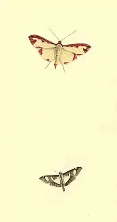 - Anterior wings, brown, with two transverse angulated white spots; posterior white at the base.