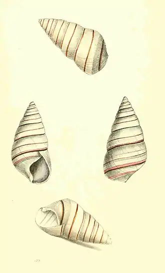 - Var. 4. Shell larger, white, with three narrow brown bands; aperture and inner lip white; basal whorl in the middle slightly carinated. Upper and lower figures.
